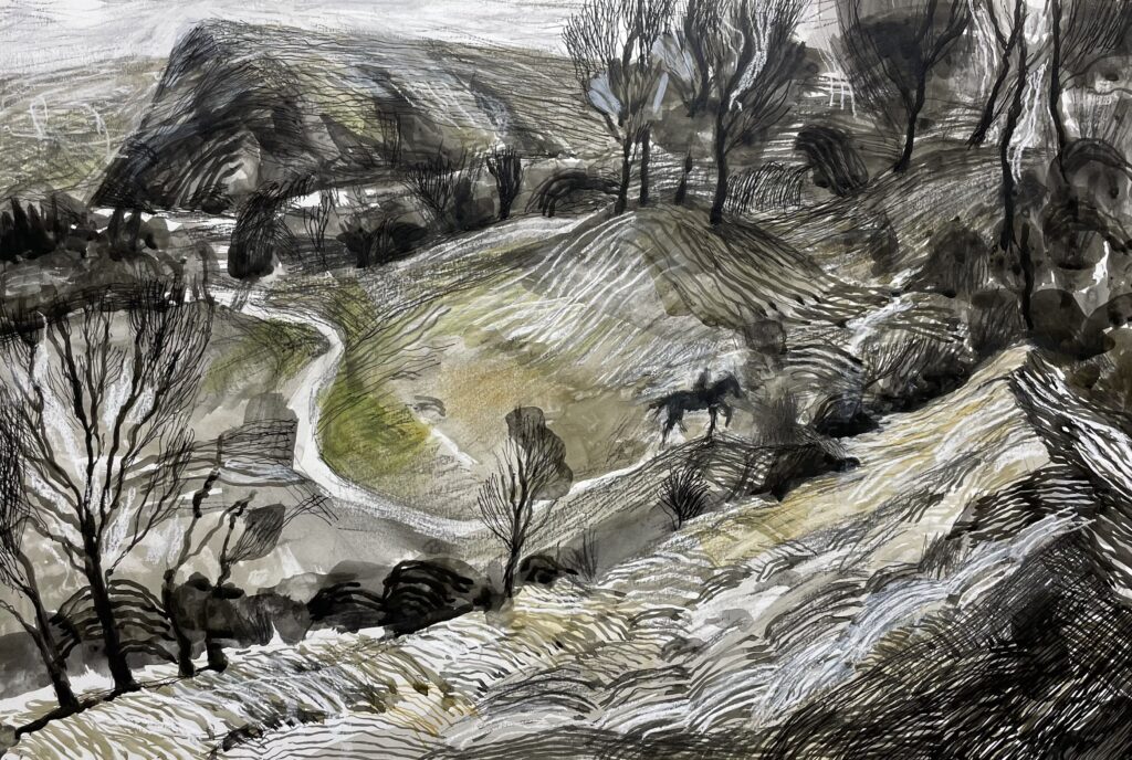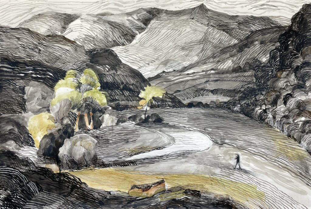 In recent years, Mills has swapped her vibrant colours for a more monotone palette. Using ink and pastel, she builds her images with rhythmic linear marks, recalling the stitched details characteristic of her earlier career. She has a dynamic creative process, standing to work and constantly moving around the studio, building up several compositions simultaneously. The change in palette also ushers in change in tone. In her most recent works, Llefydd Gwyllt y Gallon (Wild Places of the Heart), nature is presented as grander, wilder and more awesome, the rounded hills of earlier works replaced by higher, more jagged and pointed peaks. Their scale dwarfs the tiny human figures depicted, which introduce a narrative to the scene but also invite us to join them on their journey through the landscape.