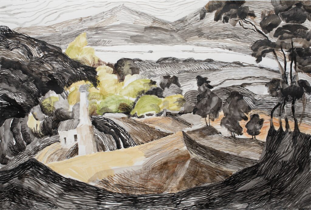 In her landscapes, Eleri Mills leads us on a journey: paths entice us deeper into the scene, rivers meander around hills and mountains, and vast oceans hint at distant worlds. For Mills, these pathways and waterways are like veins – or conduits of life – that animate her distinctly Welsh landscapes. In them, the forms of nature are tightly bound with a deep sense of history and culture, while aspects inspired by real topography are combined with elements from her imagination.