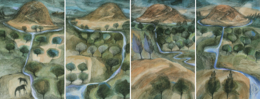 As an artist, Mills always conveys a deep spirit of place, inspired by the topography of Powys but adapted and reshaped to evoke a more mythical landscape. This is a place of the heart, replete with both personal significance and cultural or historical import, which she hints at in her titles. The quadriptych Tirlun i Dywysogion (Landscape for Princes) was conceived following a visit to Sycharth, home of Owain Glyndŵr, the last native Prince of Wales.