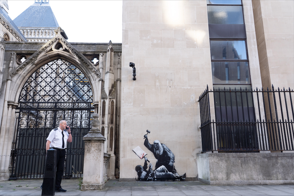 As for the actual Banksy, the artist hit the headlines today after artwork which showed a judge attacking a protester with a gavel appeared at the Royal Courts of Justice. The artwork, confirmed to be a Bansky, is on an external wall of the Queen’s Building, part of the Royal Courts of Justice complex.