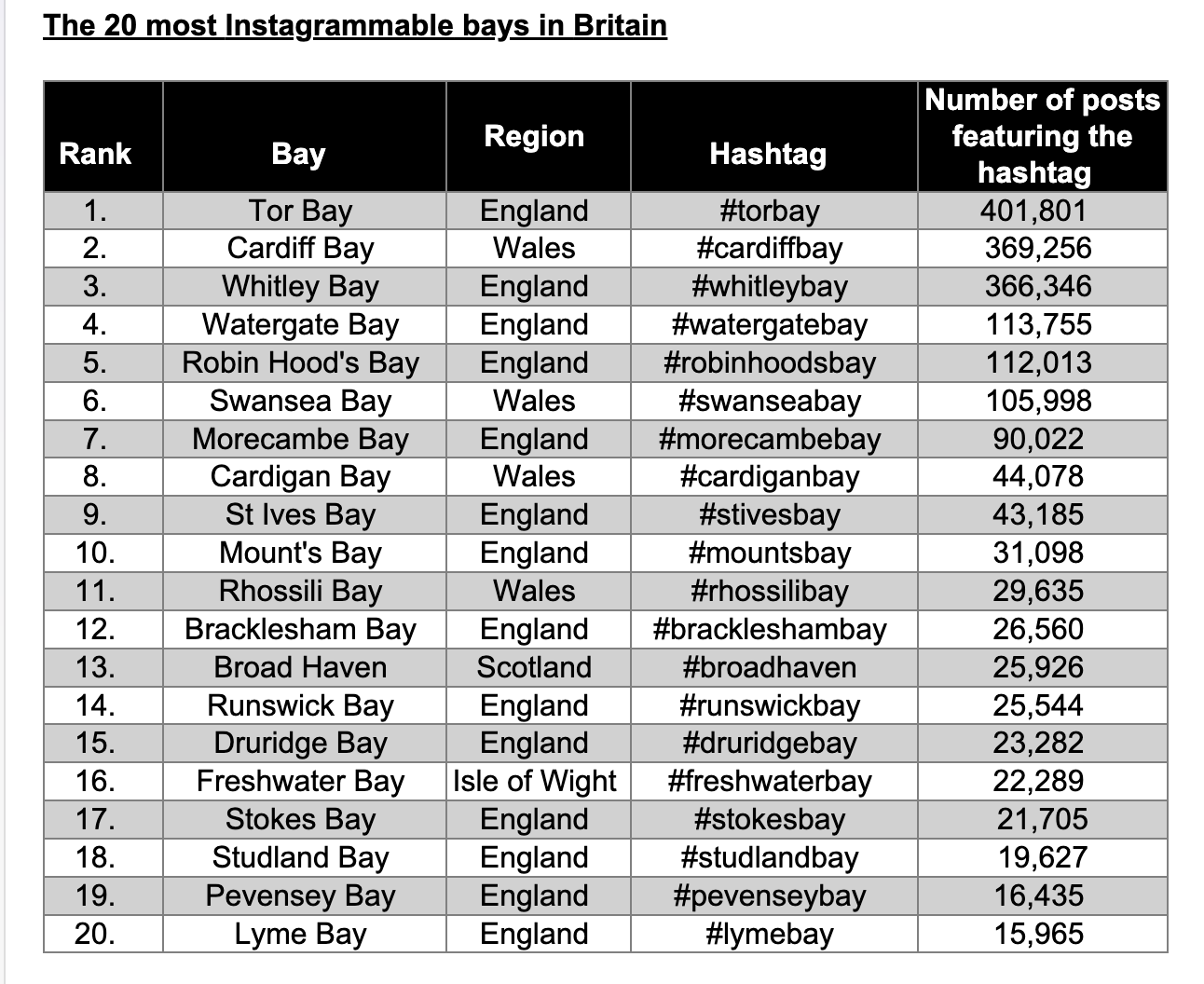 Travel experts Miro & Sons Kotor Tours analysed Instagram hashtag data for bays across Britain to uncover which coastal locations have been tagged the most on the platform by users.