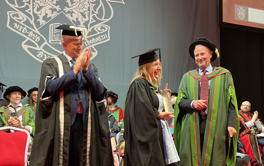 Rachel Frum received a unique piece of sculptural glass made by Rodney Bender, IGP Ltd and generously sponsored by Ali Anwar, CEO of the H’mm Foundation. The award was presented at Aberystwyth University’s graduation ceremony held at Aberystwyth Art Centre on the 17th July.
