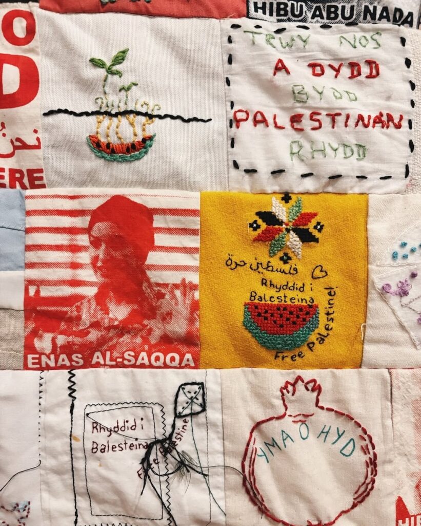 “This quilt began as a project in November 2023, with the intent to encourage people to engage creatively with activism, as well as create a record of the broader Palestine solidarity movement in Wales.