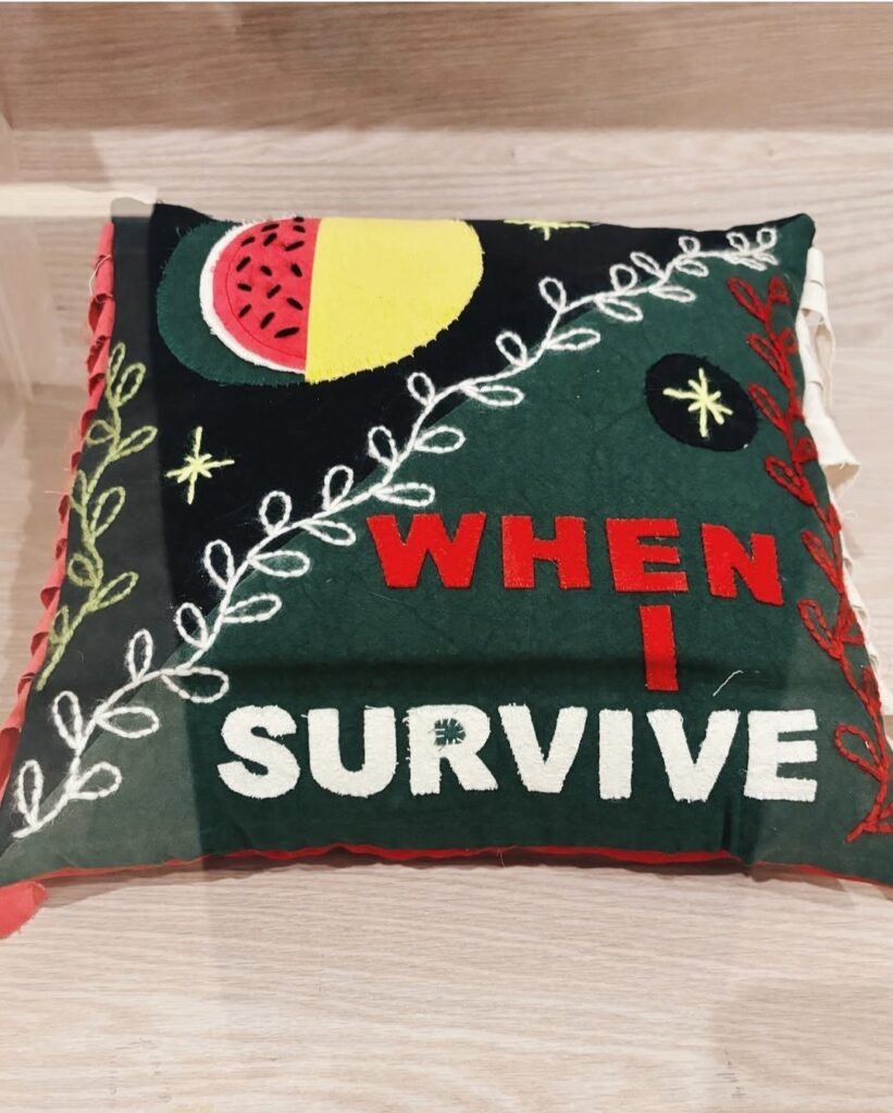 The original artwork for the fundraiser album ‘When I Survive’ has been sewn into a cushion to be exhibited at Tenby Museum & Art Gallery.