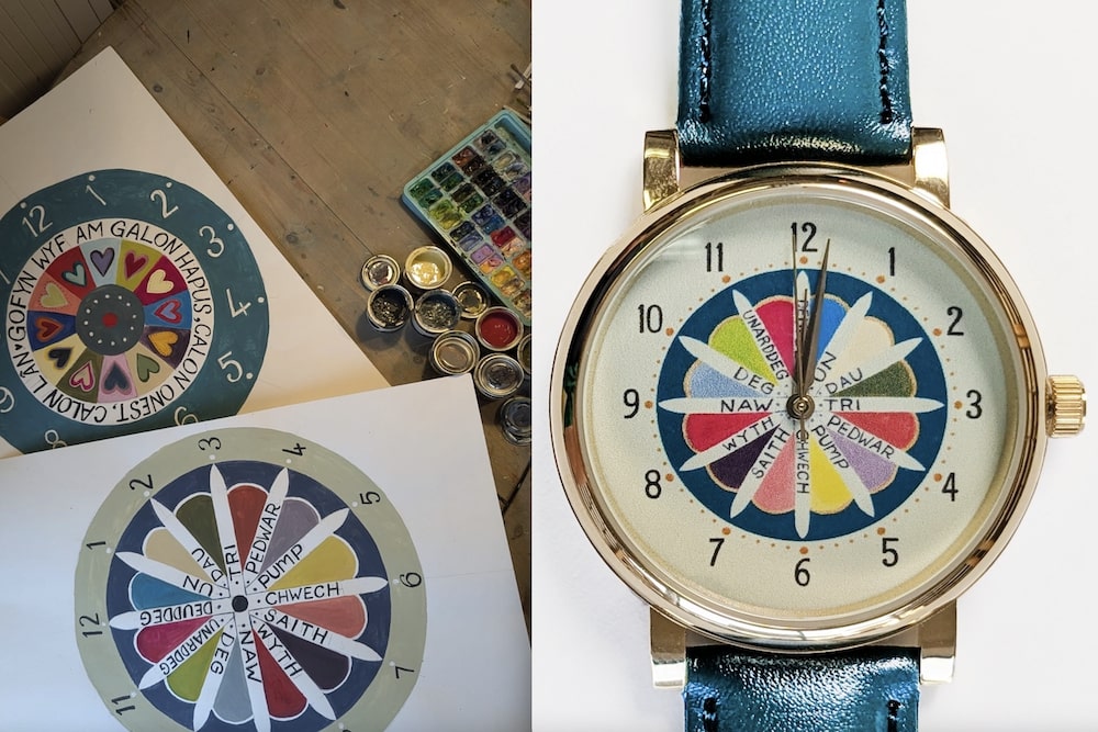 The timepiece was designed to be vibrant, beautiful and legible without the call for reading glasses. The original design was inspired by the geometry of flowers and the desire to include the numbers in Welsh written form. The result is bright and colourful and does, indeed have both numbers and the corresponding Welsh words written on its face.