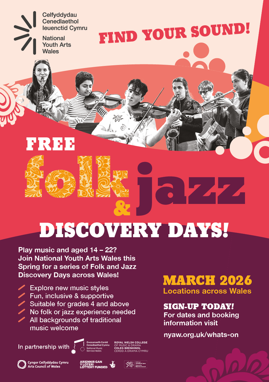 National Youth Arts Wales (NYAW) has announced free Folk & Jazz Discovery Days will be taking place across Wales this March, offering young musicians aged 14–22 the chance to find their sound.