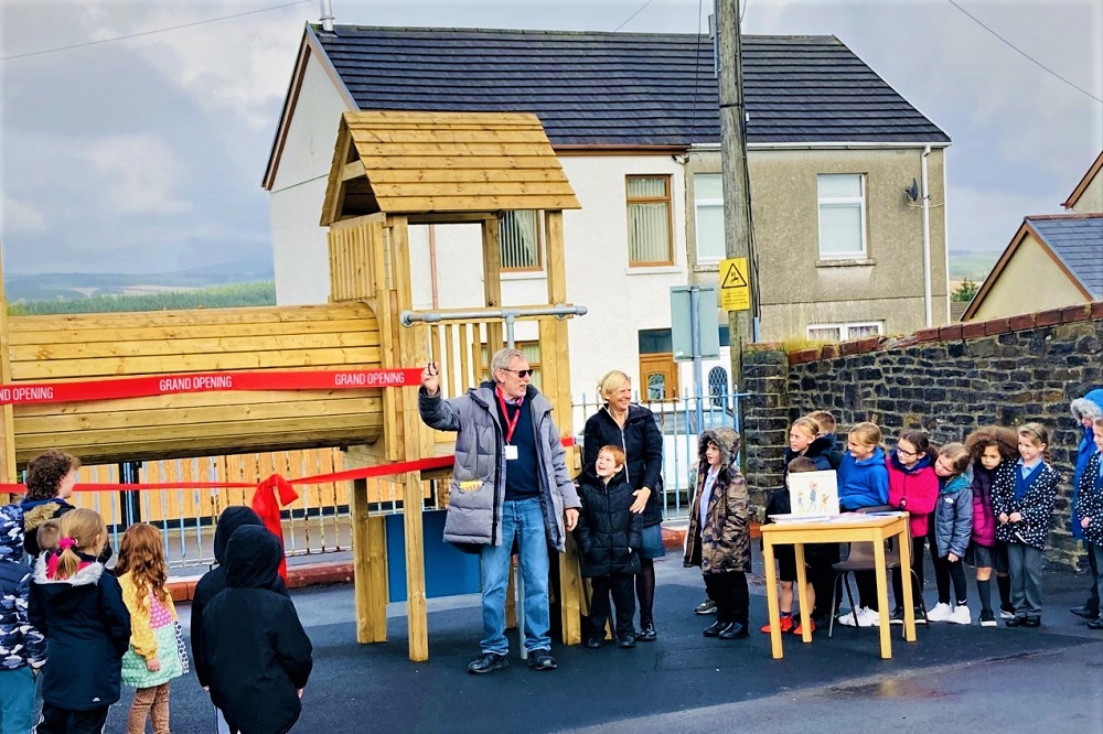 The playground equipment opened by the author came from a play grant given to the school where the children took a lead role in deciding on the design of the equipment.