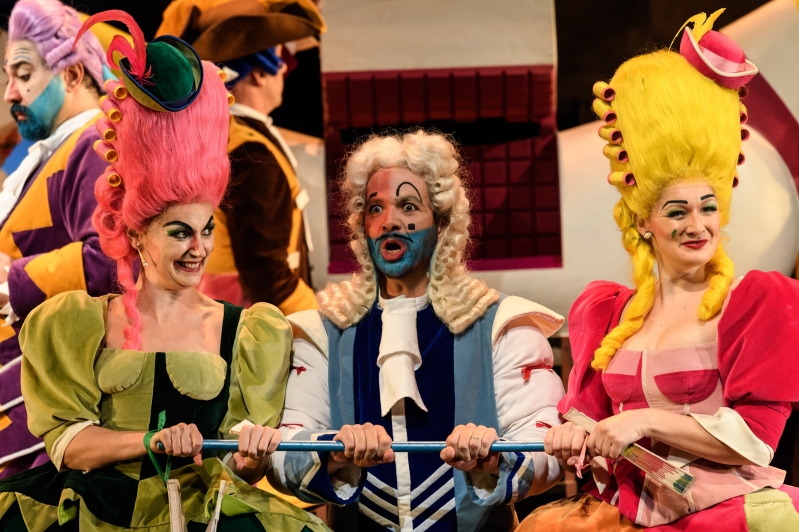 As the narrative shuffles on after the mention of the Prince’s Ball, the vibrancy of Joan Font and Xevi Dorca’s vision illuminates the stage as the dreamscape setting of Cinderella’s journey to the ball flourishes. Though there isn’t much hint of magic or fairies in Rossini’s version, the fairy tale is apparent after this tonal shift. Beards are bright blue, beauty spots are pink diamonds and the hair is so flamboyantly tall that it’s a wonder there was no scaffolding needed. The wide stage complete with stairs and balcony is rarely sparse. There is always something worth observing wherever you look. It is an immersive sensory experience. Not least because of the omnipresent mice (dancers in costume) who act as unhidden stage hands, shifting scenery around characters mid-song with an accentuated nod, scratch or sniff. Their self-referential use brings many giggles as they cavort, cringe or roll out red carpets.