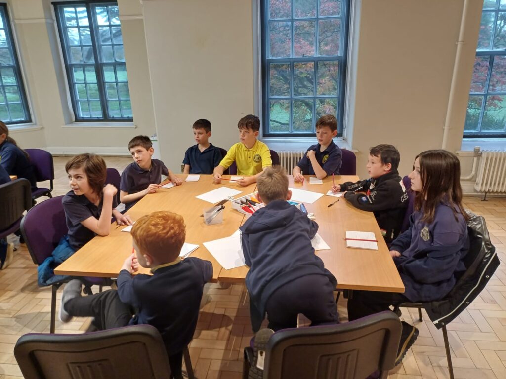 Year 5 and 6 pupils from Ysgol Abergwili took part in today’s session with Aneirin asking them to find an item in the museum’s collection to kick-start the creative process.