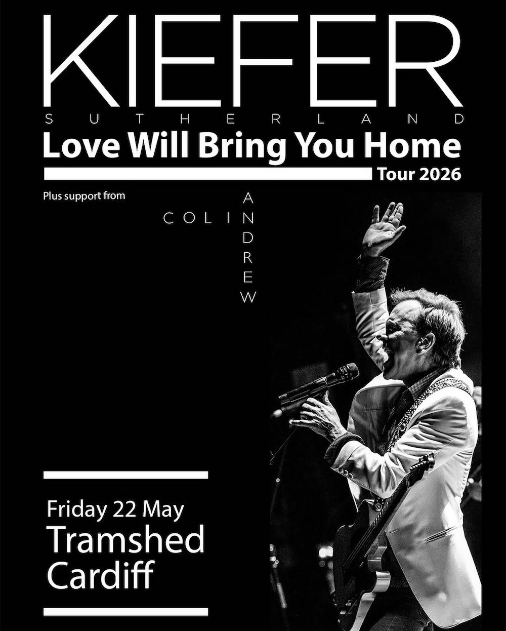 The tour announcement says: “Kiefer Sutherland is an internationally acclaimed actor, musician, producer, and director whose career has spanned more than four decades in film, television, and music.