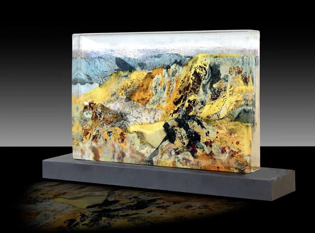 Her work involves a range of glass techniques including fusing and casting with particular reference to landscapes. Her recent work is made up of single and multiple glass blocks containing three dimensional images that reflect the Welsh landscape, based on images and memories of her own walks in Wales.