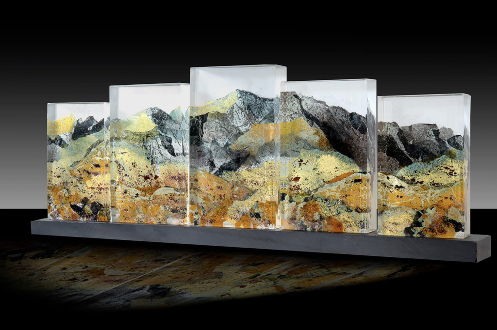 “Within each piece I try to create the feeling of motion of passing through an ever changing landscape by the use or reflection and refraction within the glass creating three dimensional effects.”