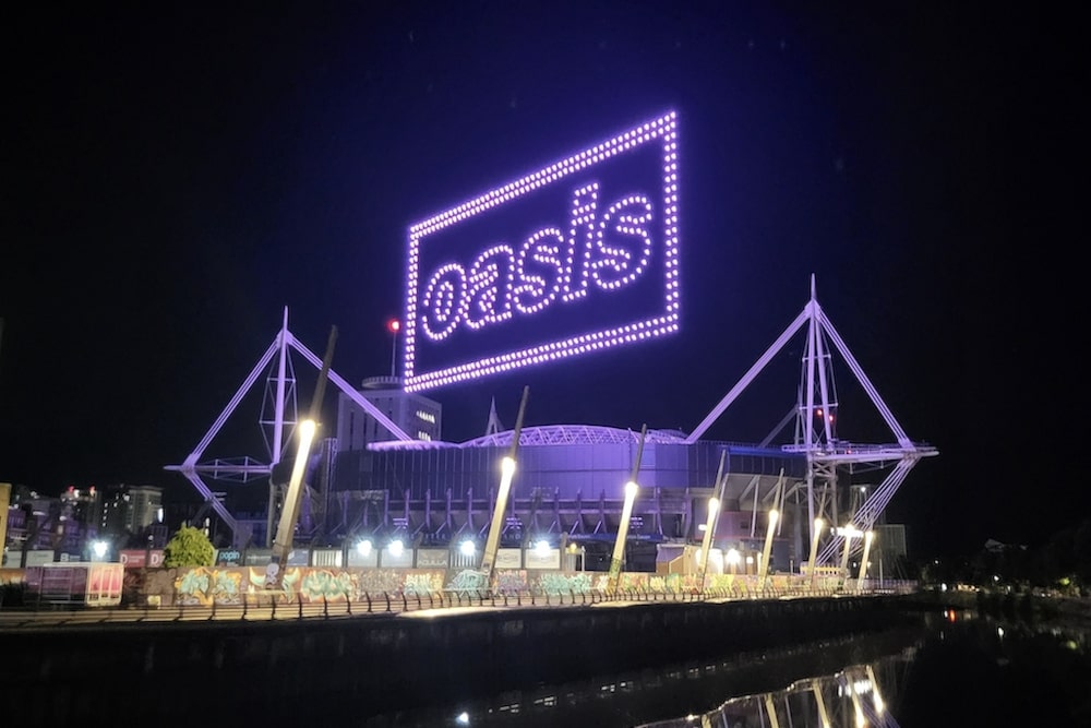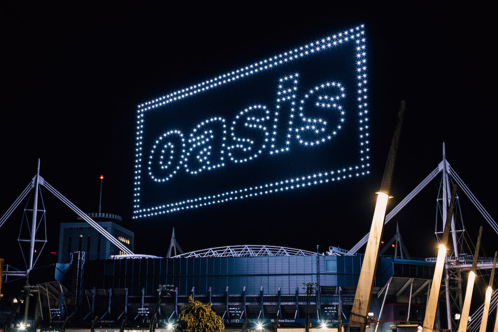 Starting at one minute to midnight hundreds of buzzing drones were launched from inside the Arms Park where they formed a giant Oasis logo in the night sky.