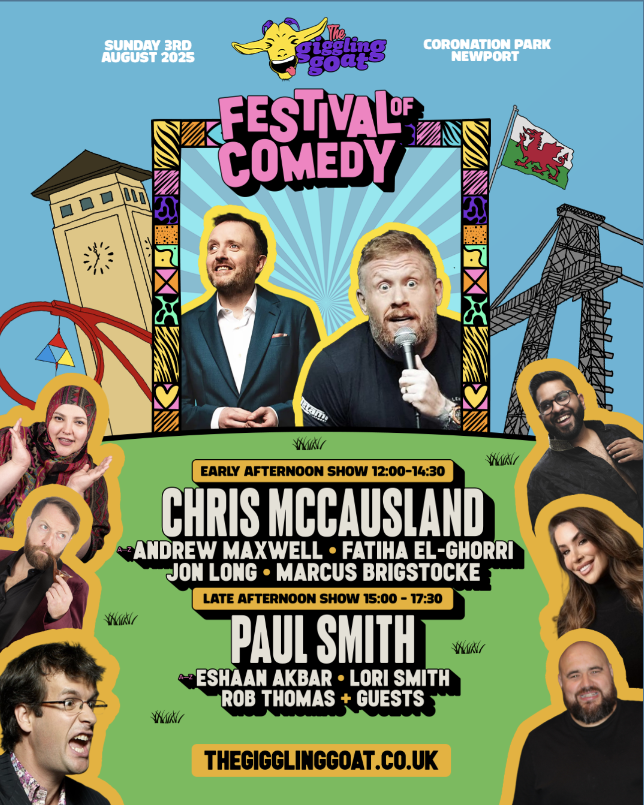 Previously held at Tredegar Park, the event takes place on Sunday, 3rd August with two sessions of comedy at Coronation Park in Newport.