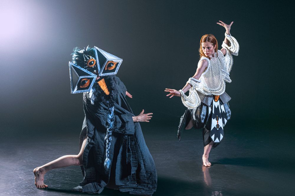 First performed as part of NDCWales’ Shorts in early 2025, Infinity Duet sees two dancers take the stage alongside a large, swinging sculpture made by Johnson Soliz, whose drawings are also featured on the costumes.