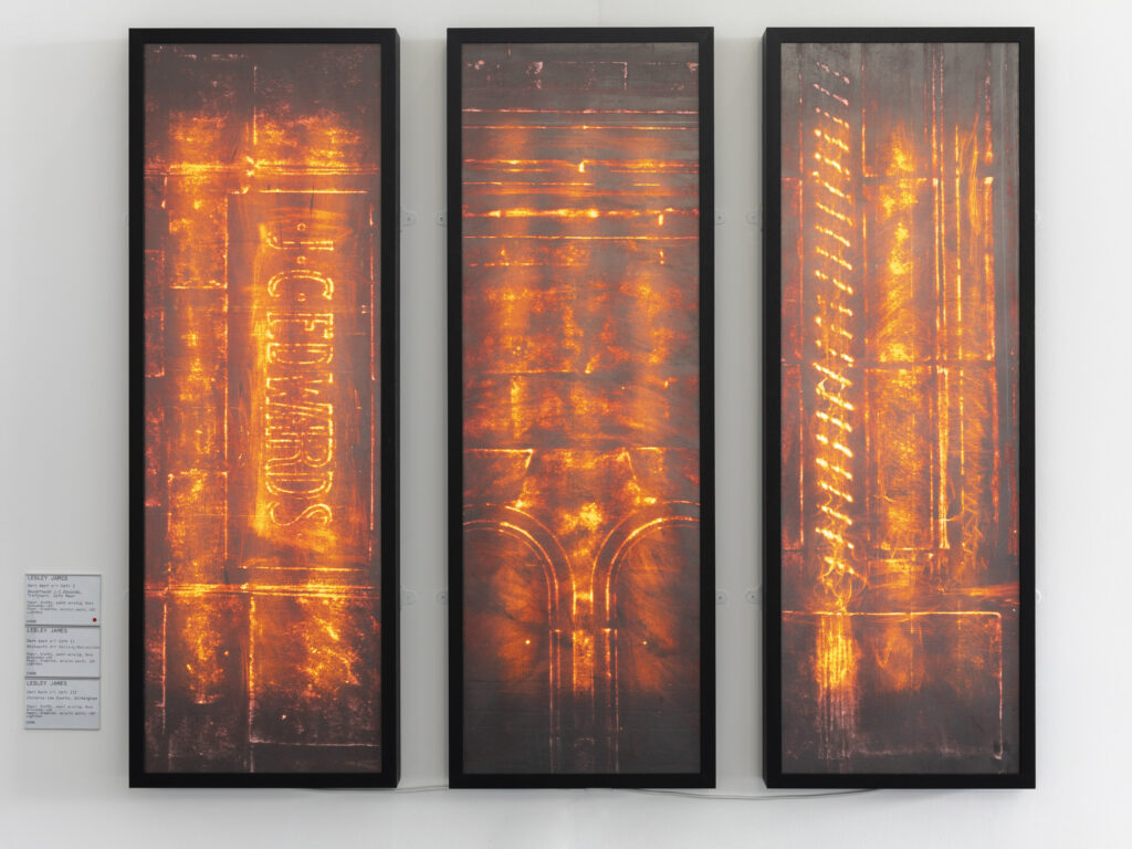 Lesley James’ Darn bach o’r Cefn I (A Little Piece of the Cefn, 2025) pays tribute to the high-quality terracotta bricks manufactured by JC Edwards, formerly based in Wrexham. The exceptional Etruria Marl clay dug from pits around Wrexham were used in such buildings as the Victoria Law courts in Birmingham, the Victoria building Liverpool University, the Pier Head in Cardiff, and The Whitworth Art Gallery, Manchester. JC Edwards’ tile and brickworks was demolished between the 1950s and 70s. Lesley explains: “I made rubbings from these major architectural buildings together with the remnants of the buildings left from the brickworks in Wrexham and incorporated them into my graphite and acrylic paper work.” The lightbox work, Darn bach o’r Cefn I, attempts to repatriate this fine legacy by bringing the artistry back to its home in Wrexham. Lesley James wanted to raise the profile in the city of the people who made the tiles and bricks as well as JC Edwards’ manufacturing works.
