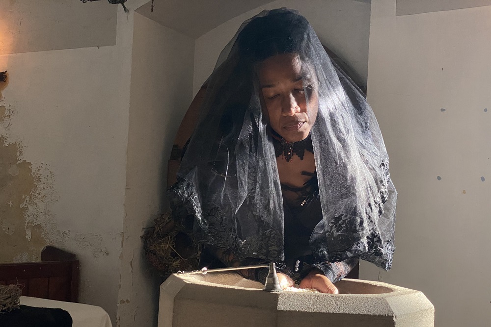 “Unexpected” might be the watchword for Spottiswoode’s conjuring up of virtual reality. In ‘Wavelength Shift’ a man wearing a fertility head decoration made of straw sweeps up leaves from the church floor, a task much like that in the Sisyphus myth where he rolls a huge rock uphill only to see it roll down again when it reaches the top. Only here more leaves blow in from outside as the straw man clears the ones inside.