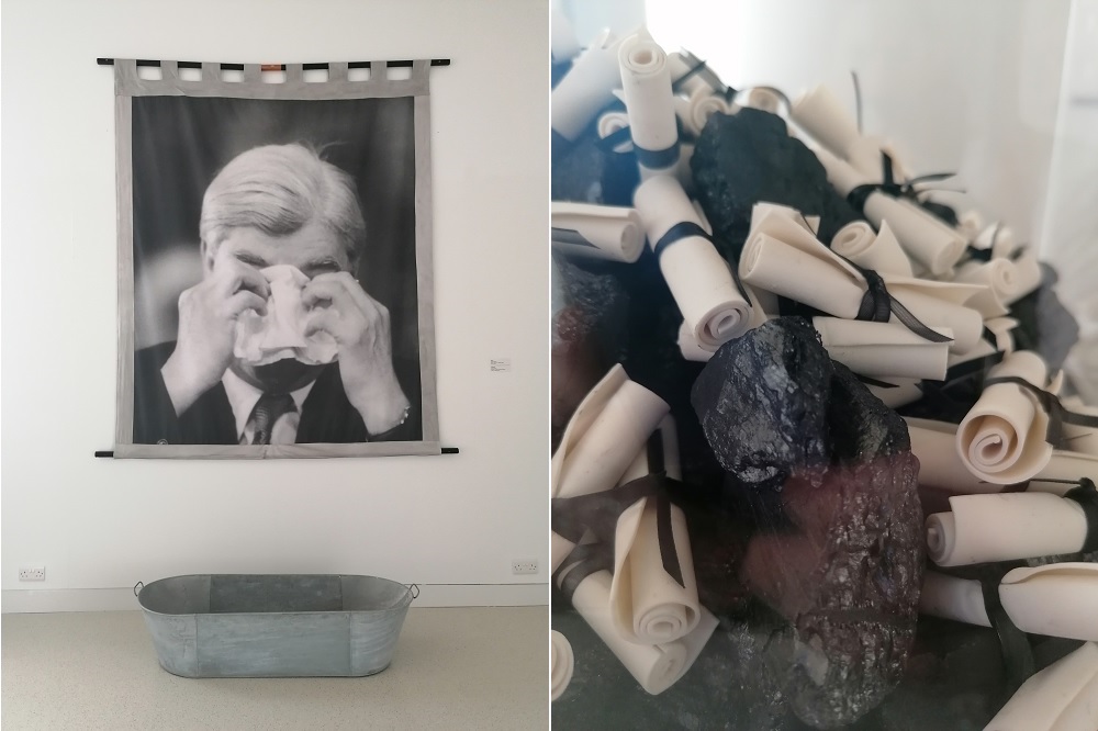 The small scale art simply consisted of coal and graduate scrolls mixed together in a heap, a mass grave of lost futures, talents, hopes and dreams of who and what might have been.