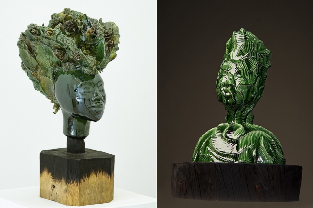 On entering Y Lle Celf five mesmerising porcelain bust sculptures pulled you in. The green glazed sculptures were beautifully displayed on oak blocks, some half burnt placed on unpainted OSB Plinths that surprisingly complemented the work.