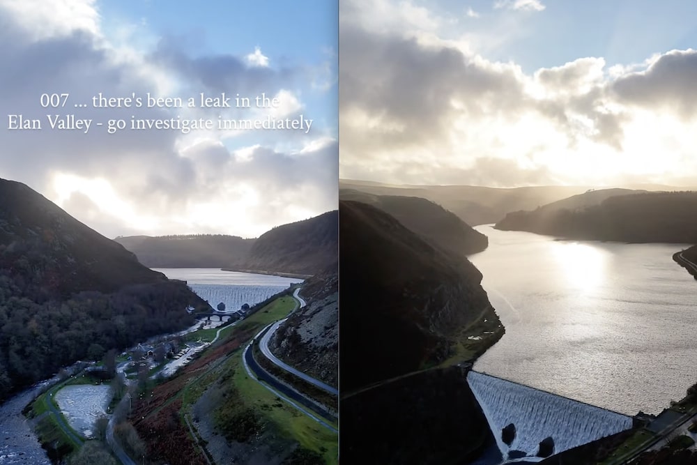 Bond composer David Arnold’s distinctive music from the 007 movie Golden Eye plays over the top of magical drone footage of the Elan Valley.