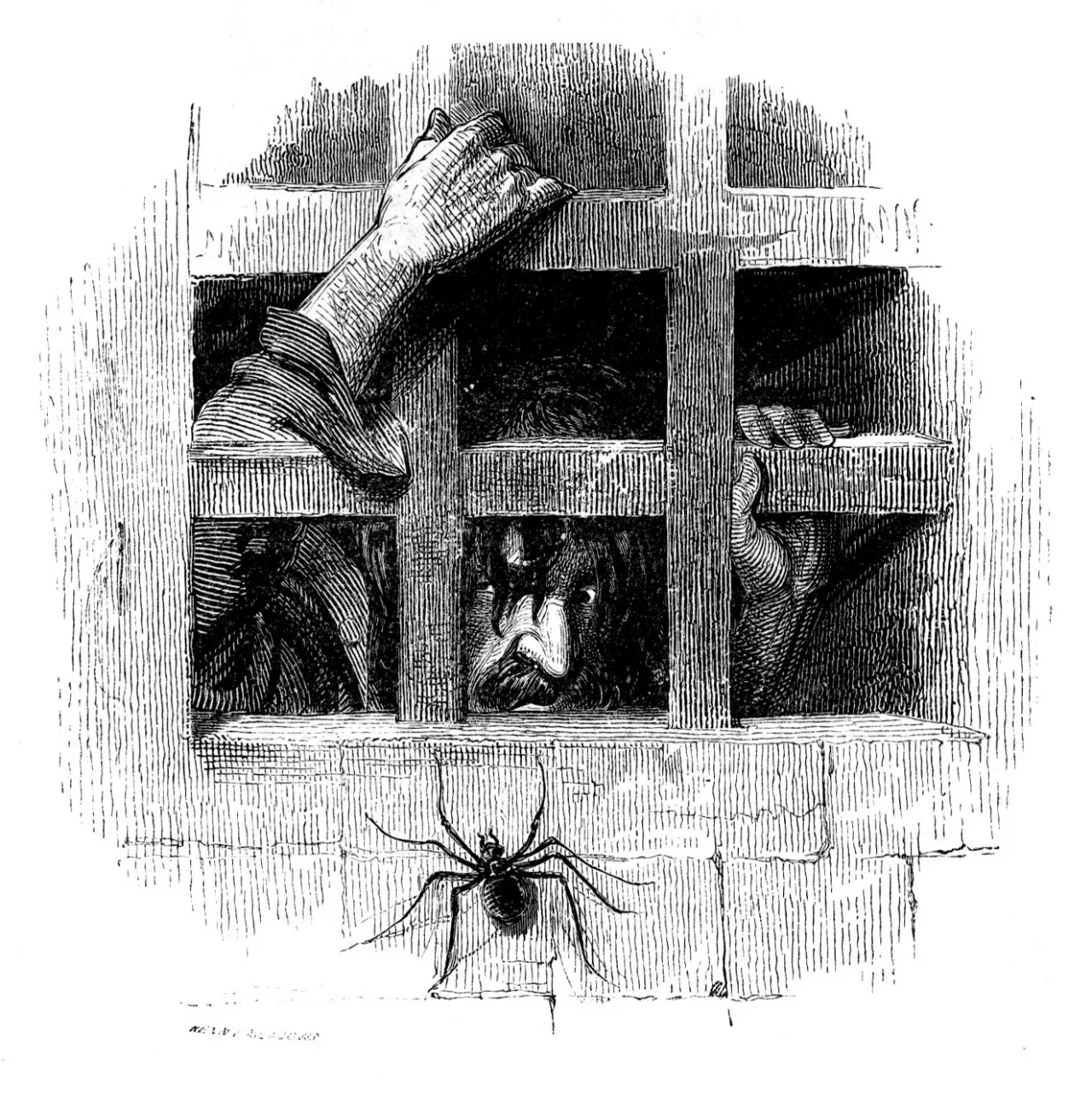 A couple of final examples, taken from Measure for Measure, to emphasise how unique Meadow’s work is: The first is the Act I Headpiece which presents the Duke, looking out deviously from behind a mask, while dark winged shapes surround him in the background. It is a disturbing image for a problematic play. The final example is Meadows’s portrayal of Barnadine, who is in his prison cell, but looks out from behind his bars in dread at his predicament, as a large spider crawls up the cell wall on the outside. There are countless images like these in the ‘Illustrated Shakspere’