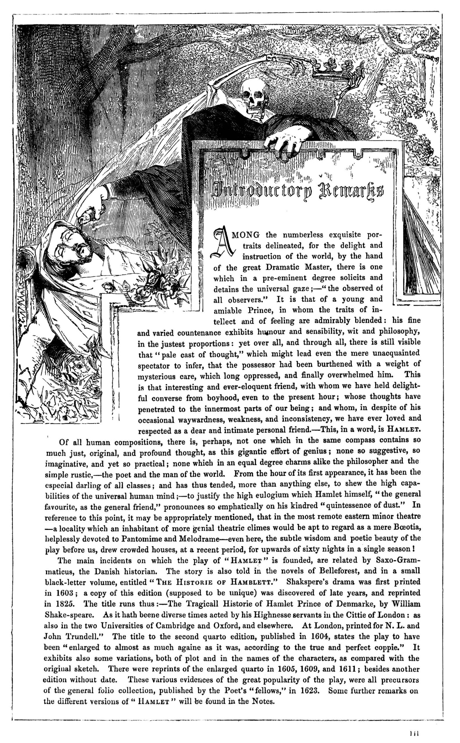 Another remarkable illustration is on the ‘Introductory Remarks’ page of Hamlet, where a skeleton is depicted as standing behind a shrouded Claudius as he pours poison into his brother’s ear. The skeleton looks on with pleasure as he grabs the crown. Meadows uses the page imaginatively so that the aforementioned ‘Introductory Remarks’ are written on a grave that Claudius is on holding on to, using the full scope of the page to express his creativity.