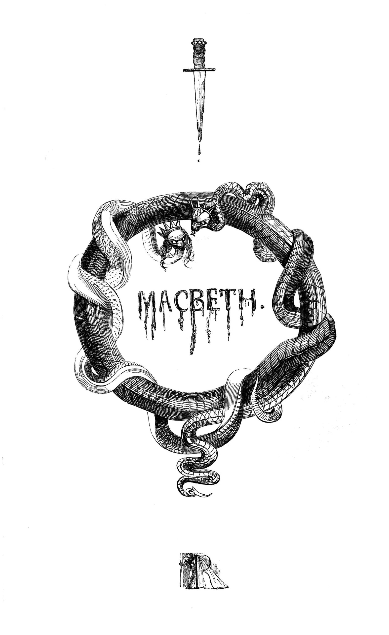 The title page of Macbeth, for example, presents both Macbeth and Lady Macbeth as snakes wearing spiky crowns, wrapped around each other in a circle, their destiny completely entwinned, while a dagger hangs above them, dripping blood. In the centre of the circle formed by the snakes the lettering of ‘Macbeth’ is also presented with blood dripping from each letter.