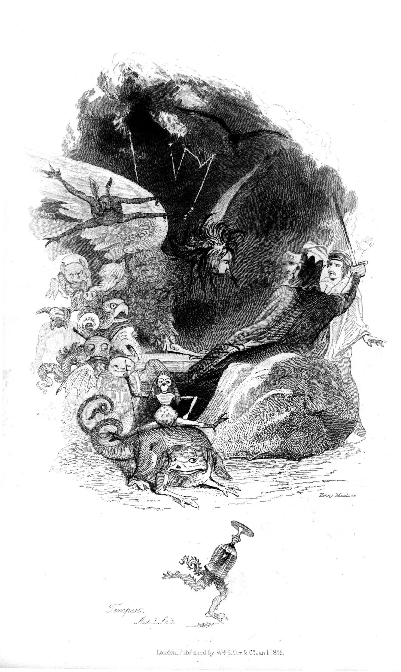 Perhaps one of the oddest illustrations is the frontispiece for The Tempest which depicts the scene from the play where Ariel appears to Alonso and the other Neapolitans, whilst ‘strange shapes’ also appear to take away the banquet. Meadows portrays the ‘strange shapes’ as very odd, weird, looking creatures – unlike anything how this scene had been depicted before or since. One of the creatures sits on top of a strange lizard holding a staff, while another one, in a comical piece of inventiveness, is seen running off with a wine glass on its head. This juxtaposition of the peculiar and unnerving with the comical is at the heart of Meadow’s work.