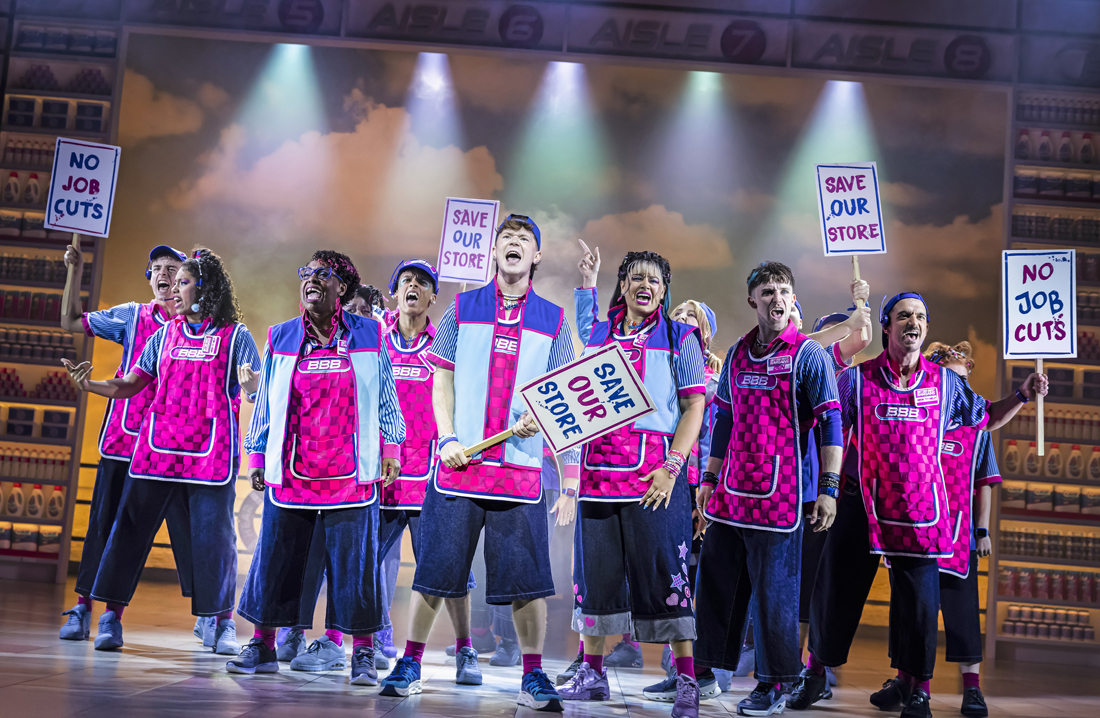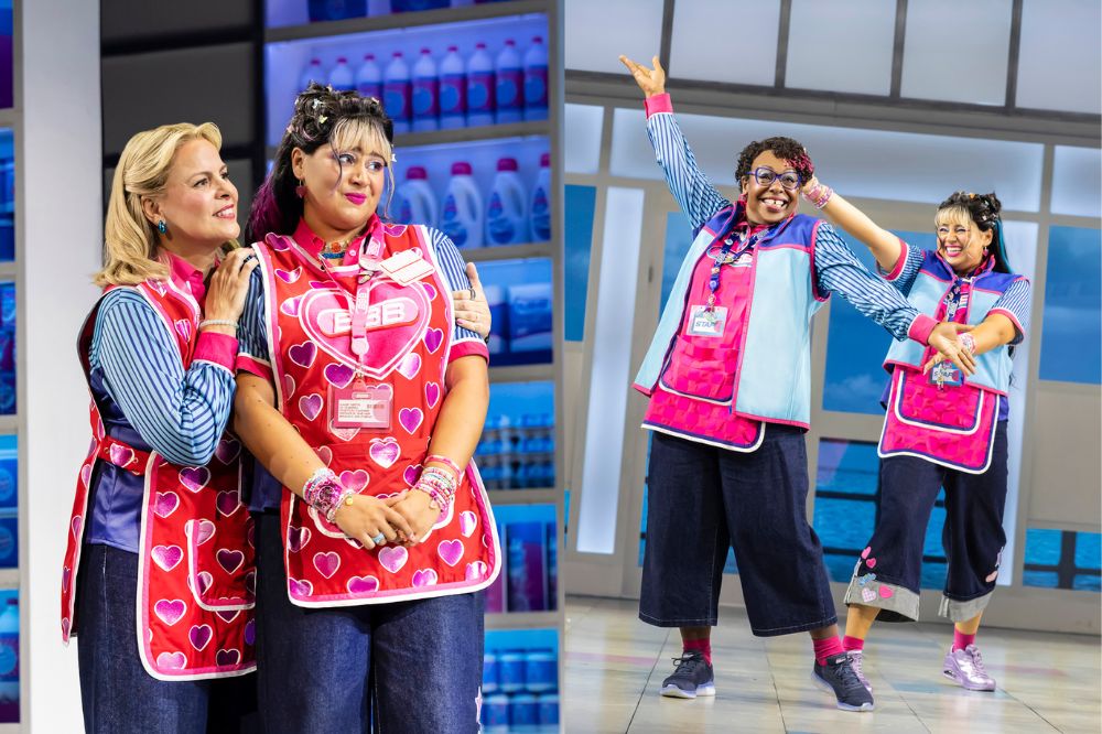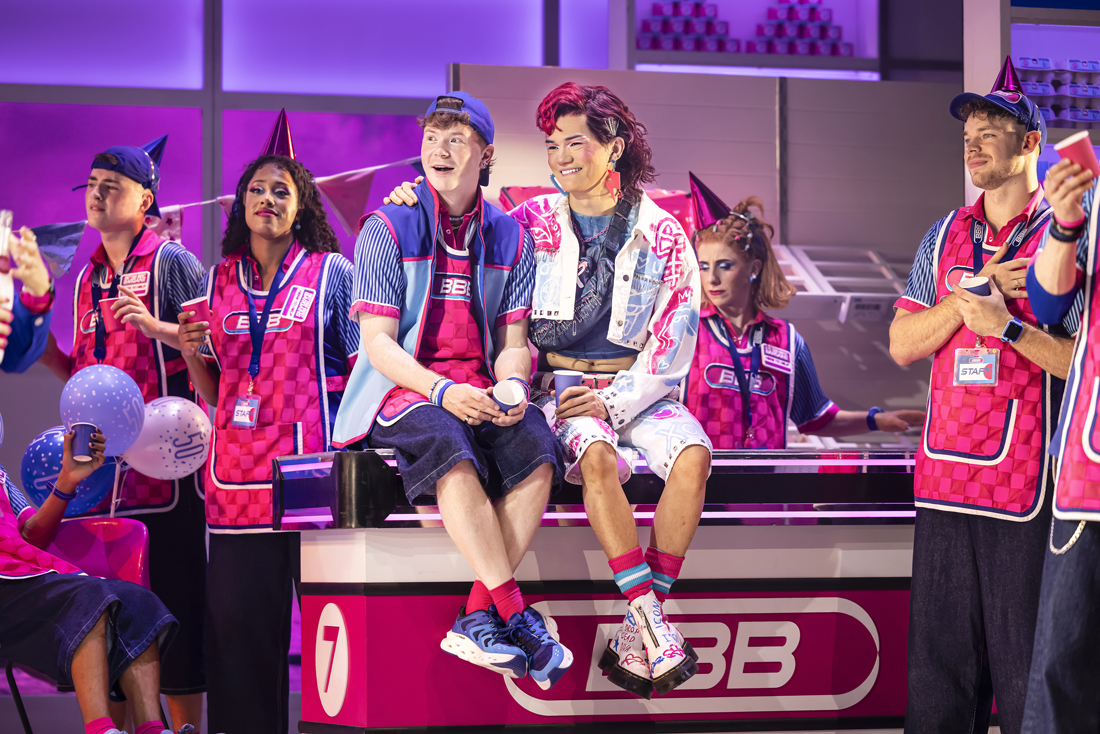 Tom Rogers’ set is overwhelming but a delight. Part seaside fantasy, part supermarket fever dream. Towering shelves of detergent stretch to the ceiling, and the stage is carved into aisles five, six, seven and eight – which was a nice touch. Gabriella Slade’s costumes amplify the pop aesthetic and Howard Hudson’s lighting is garish in the best possible way, all resulting in an atmosphere that echoes Popworld, on a better budget.