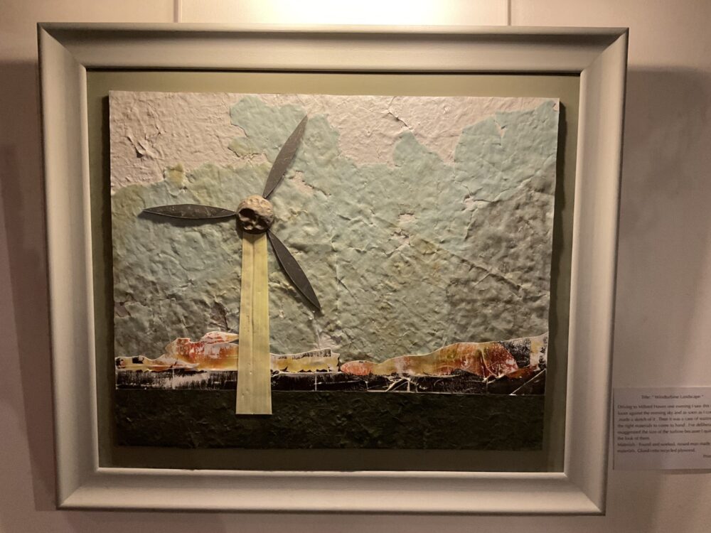 Well, not consciously anyway. I was driving from H’west to Milford one evening. Just after the village of Johnston there is a big wind turbine in the field to the right. It seemed to loom against a stormy sky (no doubt a trick of the evening sunlight) but the image caught my eye and as soon as I could I made a sketch so as not to forget. Then I realised that I had a sort of metal boss which I thought would look good as the centre of the actual turbine blades.