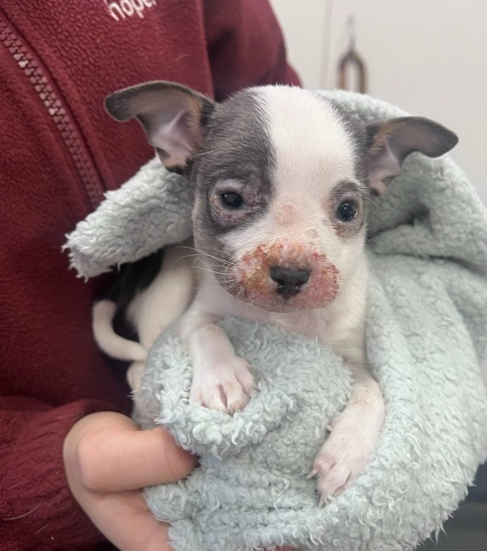 Stuart Little, pictured above, is a 9 week old Chihuahua who is suffering from a condition called ‘Puppy Strangles.’