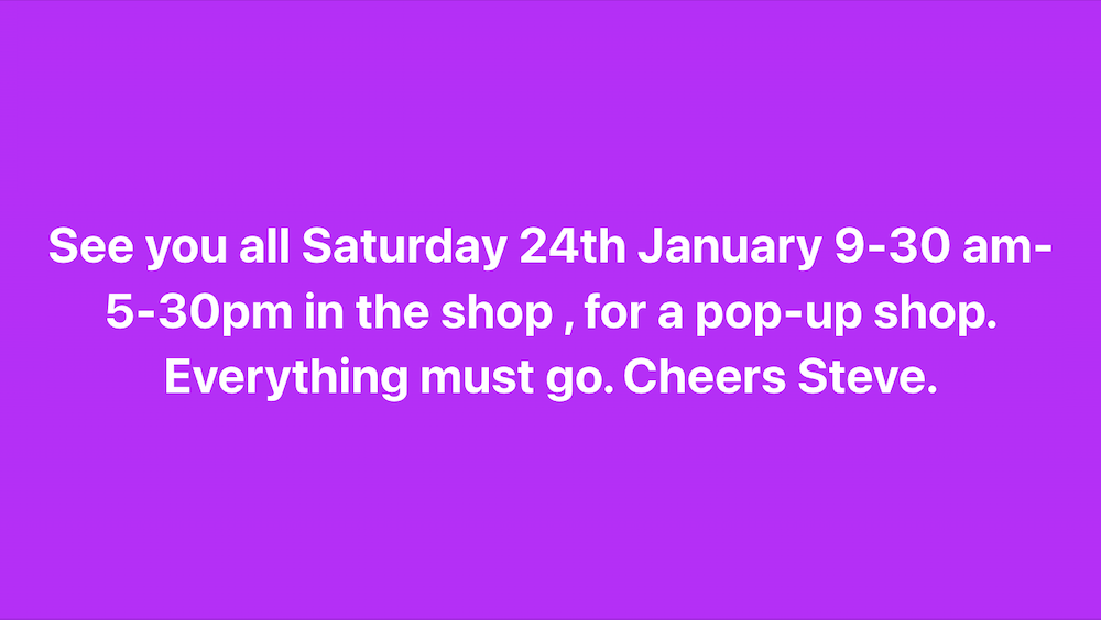 “Well believe it or not, while emptying my garage and shed I’ve found lots and lots of stuff I’ve forgotten about, all in great condition. So, drum roll, Saturday the 24th. January a “pop up shop” 9-30am – 5-30 pm. Hope you an all make it.