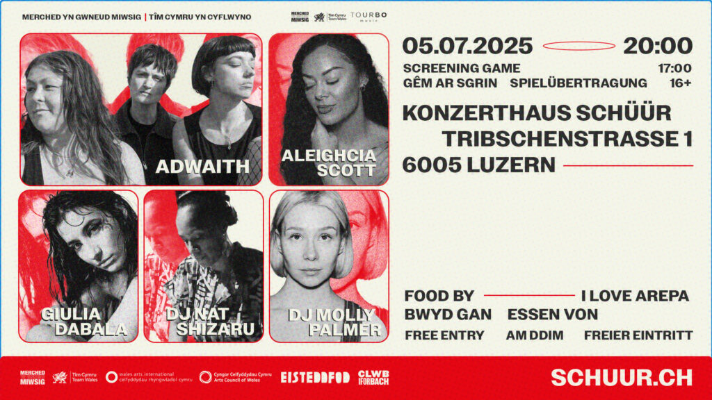 A free collaborative gig at Konzerthaus Schüuür, Lucerne after the match will showcase the vibrant and diverse talent of Wales and Switzerland – with performances from Welsh favourites Adwaith, Aleighcia Scott, and DJ Molly Palmer, joined by Swiss artists Giulia Dabala and DJ Nat Shizaru.