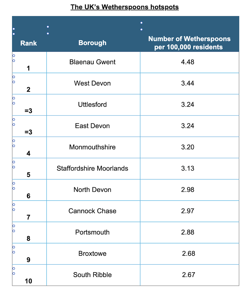Only the areas with at least two Wetherspoons and a population of more than 50,000 were included in the ranking.