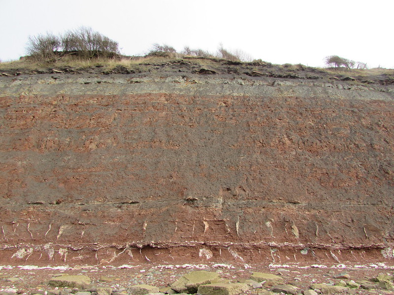 Aust also teaches about deep time. The foreshore here is scattered with rocks containing many fossils, fallen from the cliffs above. These cliffs are unusual in that they show clear stripes of different types of rocks consisting of a white layer near the base, a wide layer of red sandy rock and a top layer of more recent clay soil.