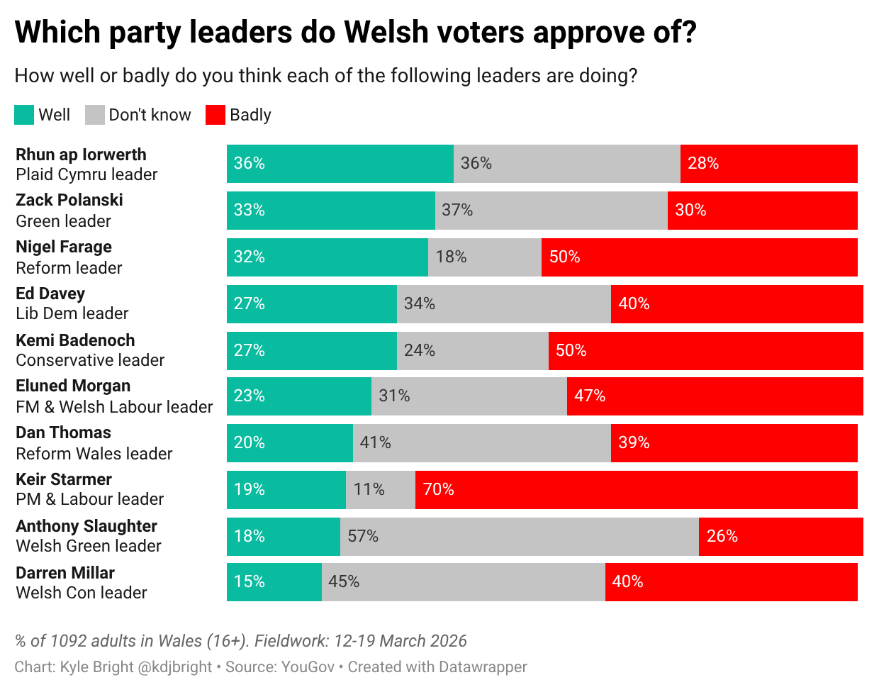 Meanwhile, Farage’s Welsh counterpart, Dan Thomas, is hampered with 40% of Welsh voters disapproving of his leadership. However, a similar amount of people do not have a view at all on how he is doing as Welsh leader.
