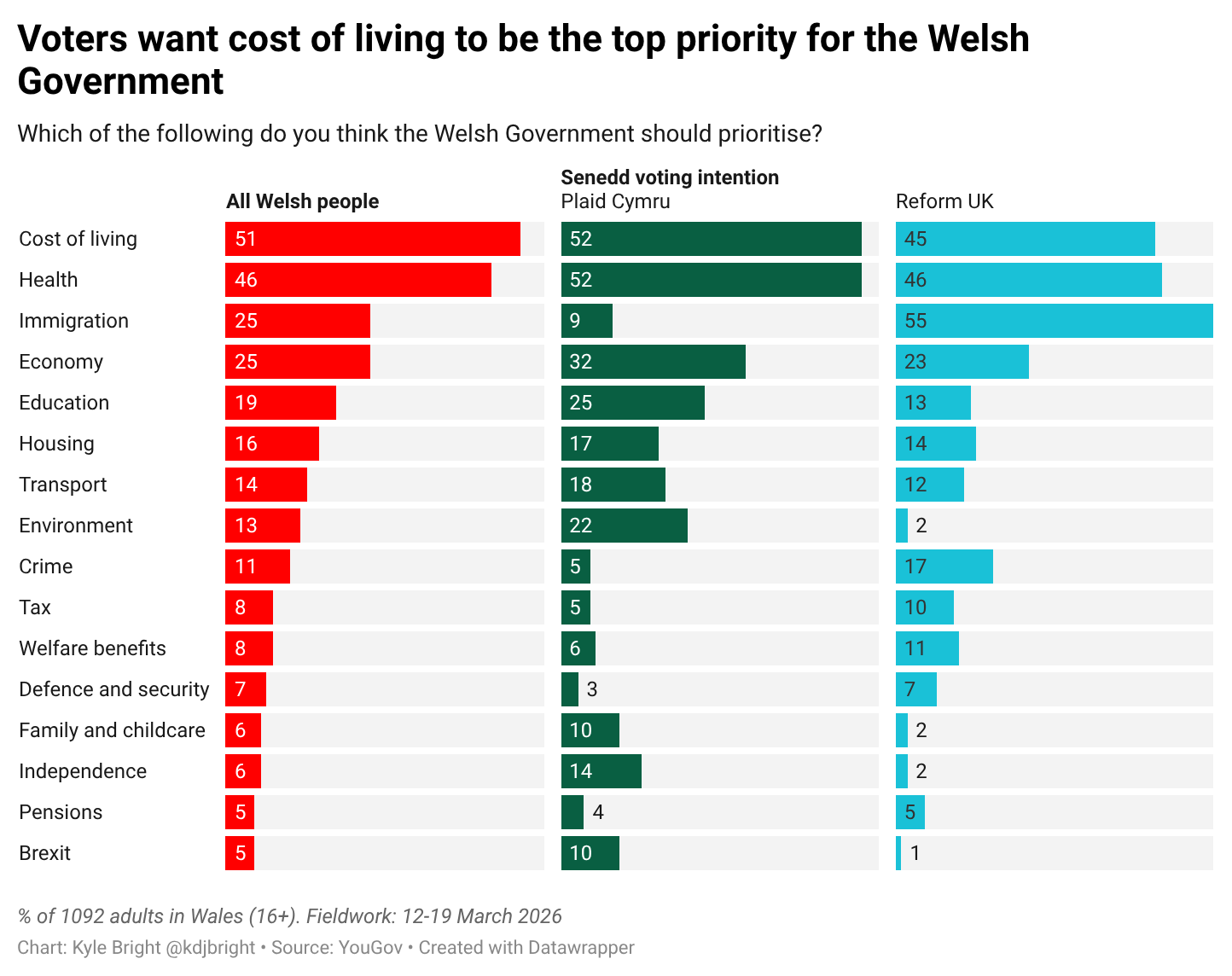 Certain issues reveal the polarisation between the two front-running parties in this election. Issues such as immigration, which is not devolved to the Senedd, is a top priority for Reform UK voters, while not even 1 in 10 Plaid Cymru voters think the issue is worth prioritising.