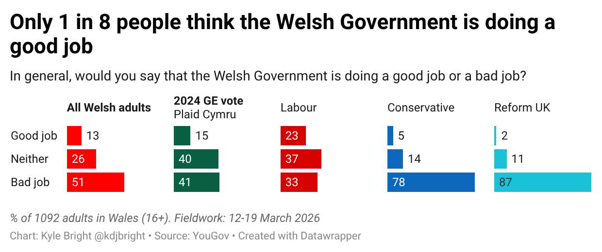 Polling across Wales echoes this sentiment. According to YouGov, only around 1 in 8 Welsh adults believe the Welsh government is doing a good job.