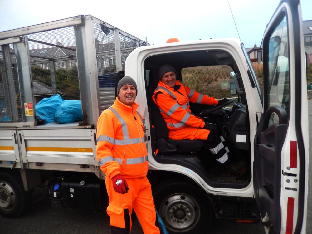 There are plastic roses tangled in the seaweed. “They put them on the benches” explains Iggy, who is emptying rubbish bins with Ray (who is learning Welsh) “and the wind blows them around.”