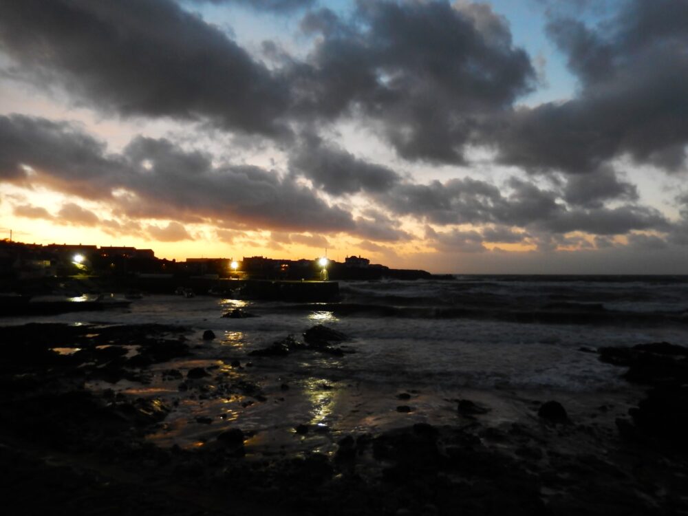 The wind whips the harbour to Guinness. Stout-black waves rebounding off the jetty colliding with swell that spews spindrift. White foam, white lamps, white moon.