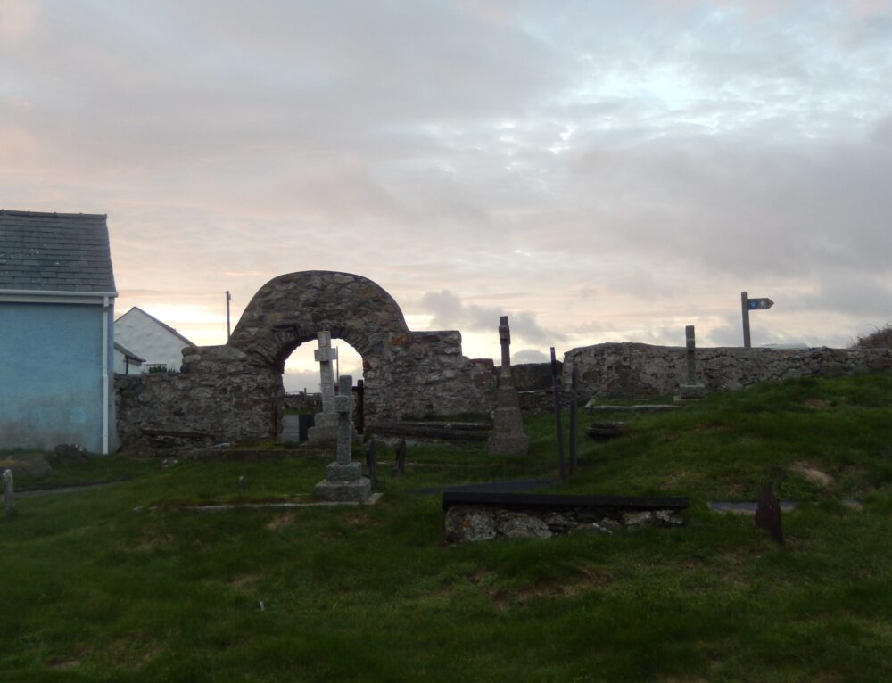 We watch Yr Wylfa from Eglwys Llanbadrig, the little church allegedly founded by Saint Patrick who was shipwrecked on Ynys Badrig. It has Moorish blue tiles and stained glass installed in 1884 by Lord Stanley who converted to Islam after marrying Fatima Santiago. Its timbers creak like a boat.