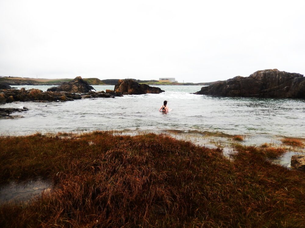 Rob makes arancini and remembers doing surveys for Rhyd-y-Groes windfarm back in the nineties. Mark hates nuclear, appreciates Brutalist architecture, takes photos of Yr Wylfa. I prowl about in the gloaming, when first light is a small blue square in Eglwys Llanbadrig. When herring gulls flicker like cine-film across the grainy sea. One morning the sky is all fire and bleeding roses. I hear what sounds like squeaky toys and look up to see thirteen whooper swans heading west.