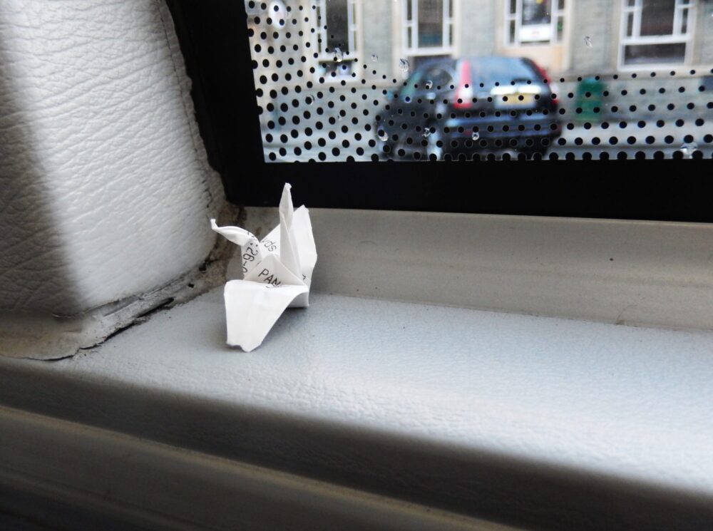 Senbazuru are Japanese origami cranes and symbols of peace. I pocket the one I find, remembering that when living in Tokyo on my first stay in Japan, I’d volunteered at Greenpeace, helping the staff understand English-language engineering reports that described how concrete in nuclear power stations was degrading. The Fukushima disaster surprised none of them, but no-one had listened.