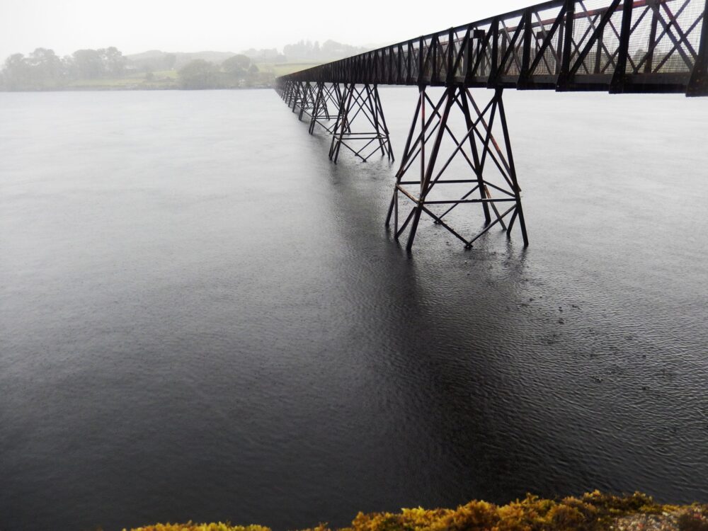 There is dark cloud against black cloud and a white-crimped inky wash. Pale light falls on birch leaves, then the oak-woods give to heather and bog myrtle, and an orange windsock troubling a grey sky. Just by the footbridge (currently closed), swallows overshoot the reservoir wall, swooping in spite of the rain, close enough to clearly see the ring of white in their tails.