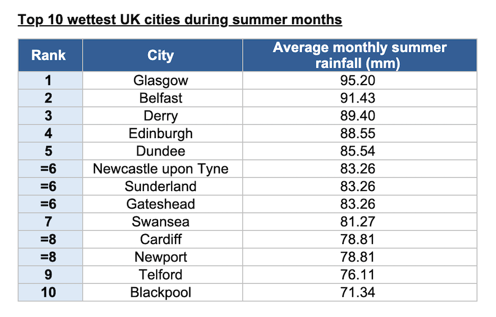 A new study has identified the UK cities most likely to experience high rainfall during the summer months.