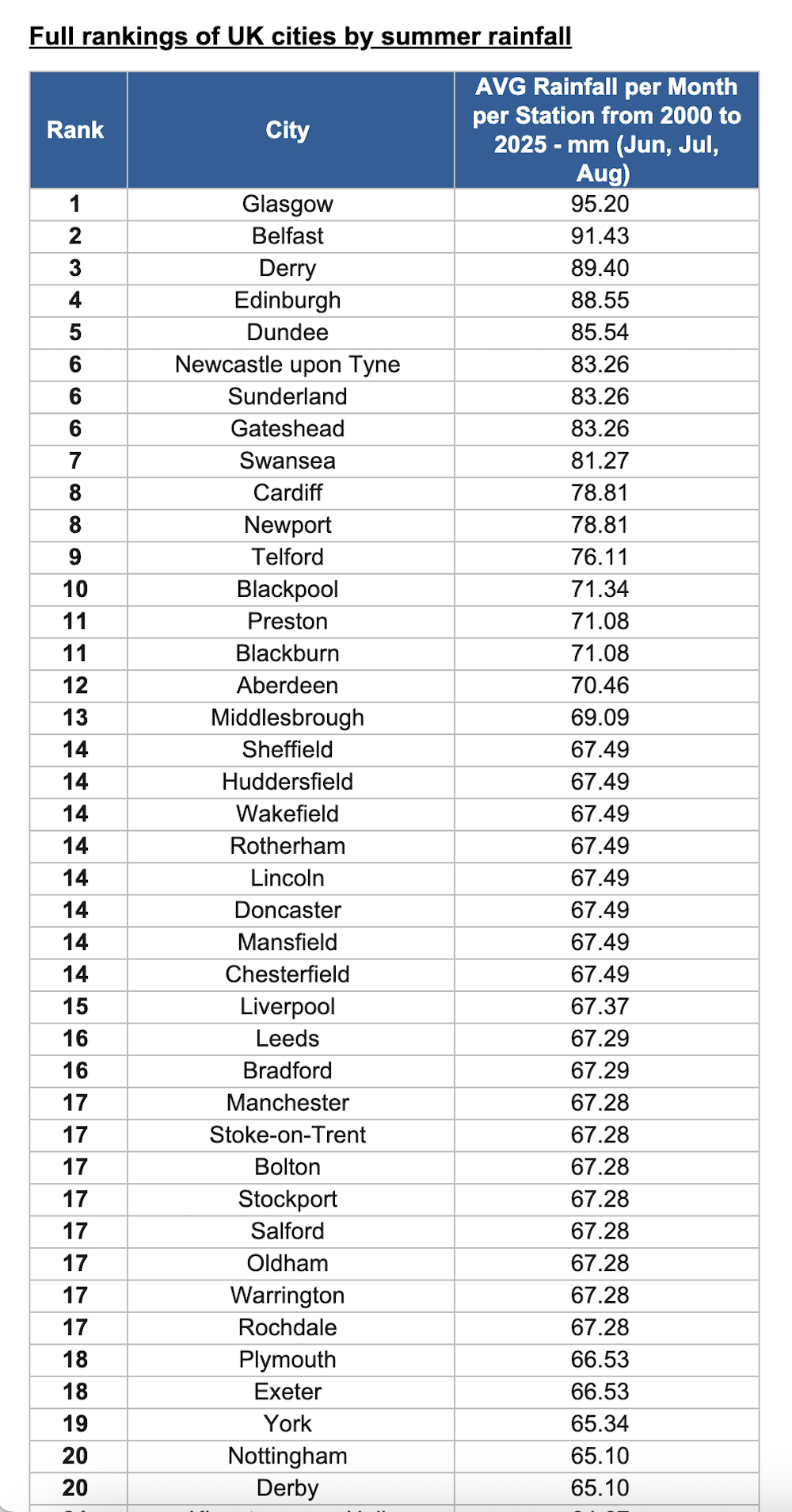 Glasgow has been revealed as the UK’s wettest summer city, with an average monthly rainfall of 95.20mm during the summer period. The city’s closest weather station, located in Paisley, records an average of 82.97mm and contributes significantly to Glasgow’s top ranking.