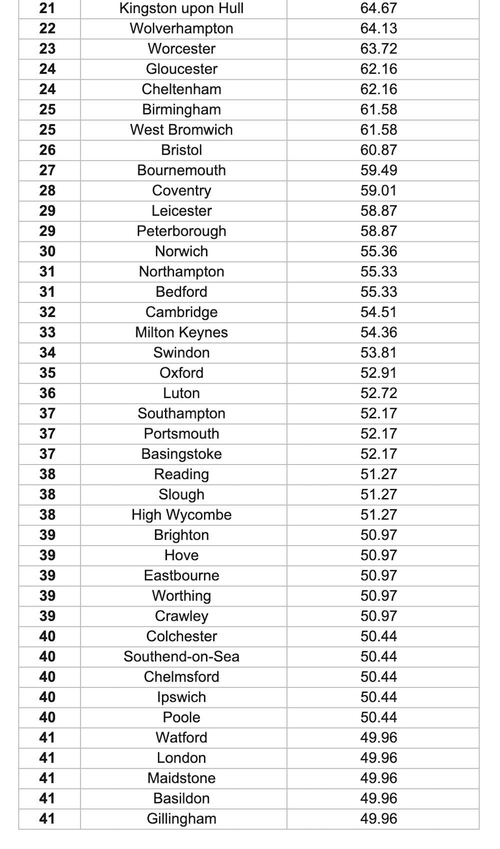 And if you thought Wales might top the charts you’d be mistaken – although Welsh cities Swansea (7th), Cardiff and Newport (joint 8th) do make the top 10.