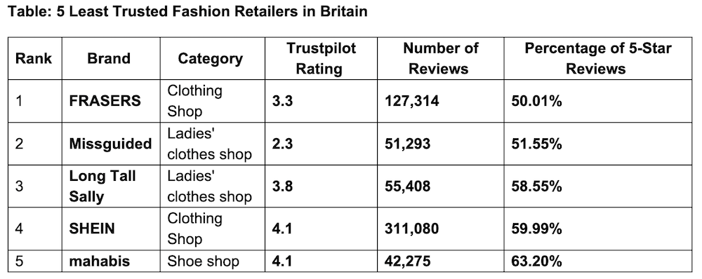 A new study has identified the most trustworthy fashion and footwear retailers in the UK based on their Trustpilot ratings.