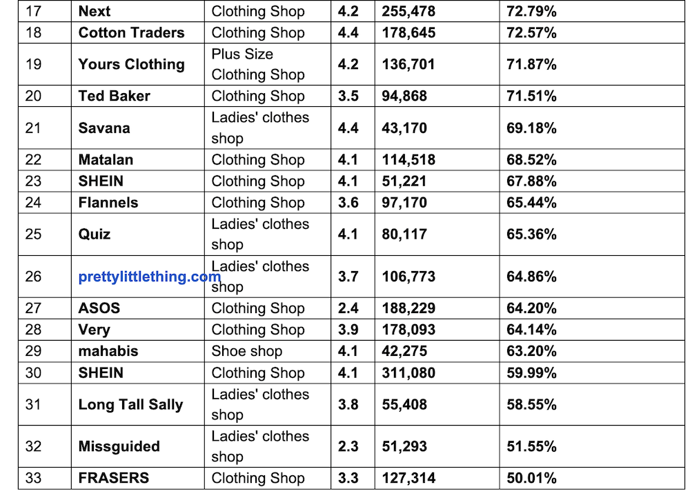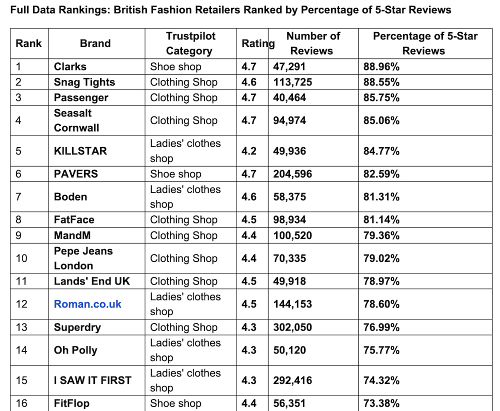 The fashion retail sector remains fiercely competitive in Britain, with brands fighting for consumer loyalty and visibility in online and physical spaces. One simple metric that helps cut through the confusion is the percentage of five-star reviews, which gives a clear indication of customer satisfaction.