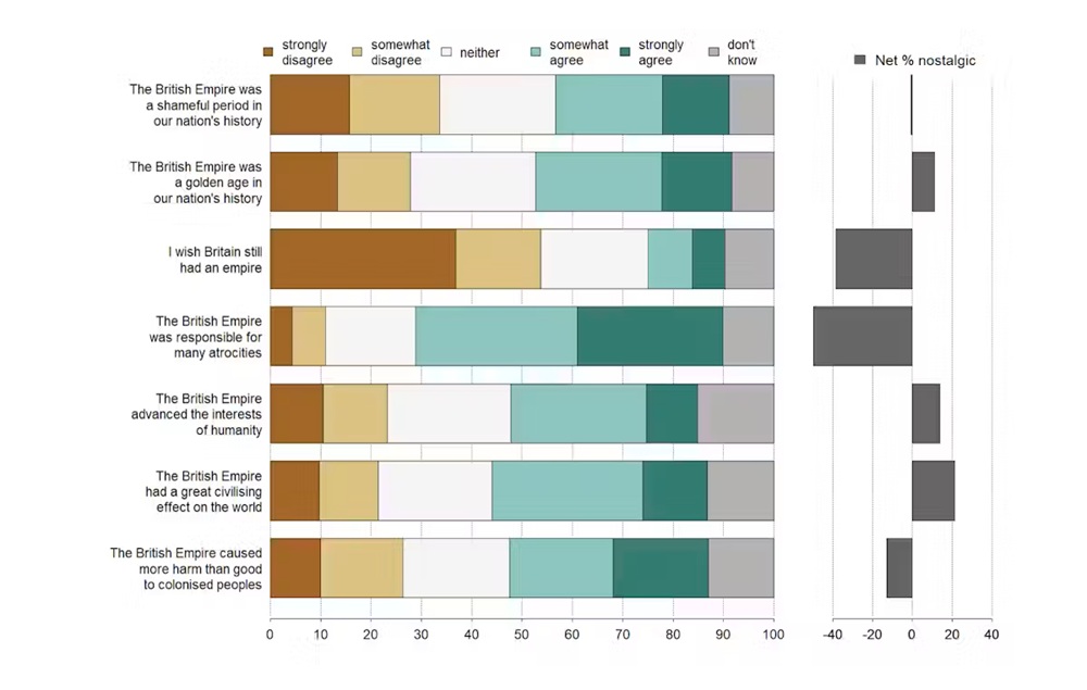 Between a quarter and 40% of respondents chose the “neither” or “don’t know” options, showing that there is substantial ambivalence in attitudes. Taken together, opinion about empire tilts slightly negative: more critical than celebratory, but far from a blanket rejection.